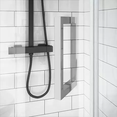 - Comes with a stylish chrome finish square door handle and a pair of wall mounted square support arms.