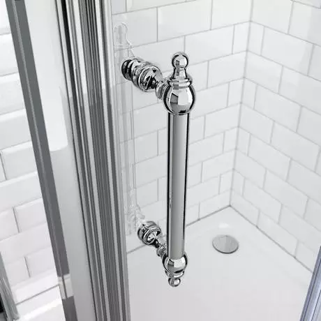 The beautifully crafted Chatsworth hinged shower door enclosure, featuring 6mm toughened safety glass with classic ball headers on the top of the frame posts and a elegant traditional style door handle. Supplied with a quality 40mm high white acrylic capped shower tray, constructed from a polyurethane resin mixed with filler including volcanic ash. If you are looking for a stylish designer look in your bathroom then our Chatsworth traditional shower enclosure range is the perfect choice.